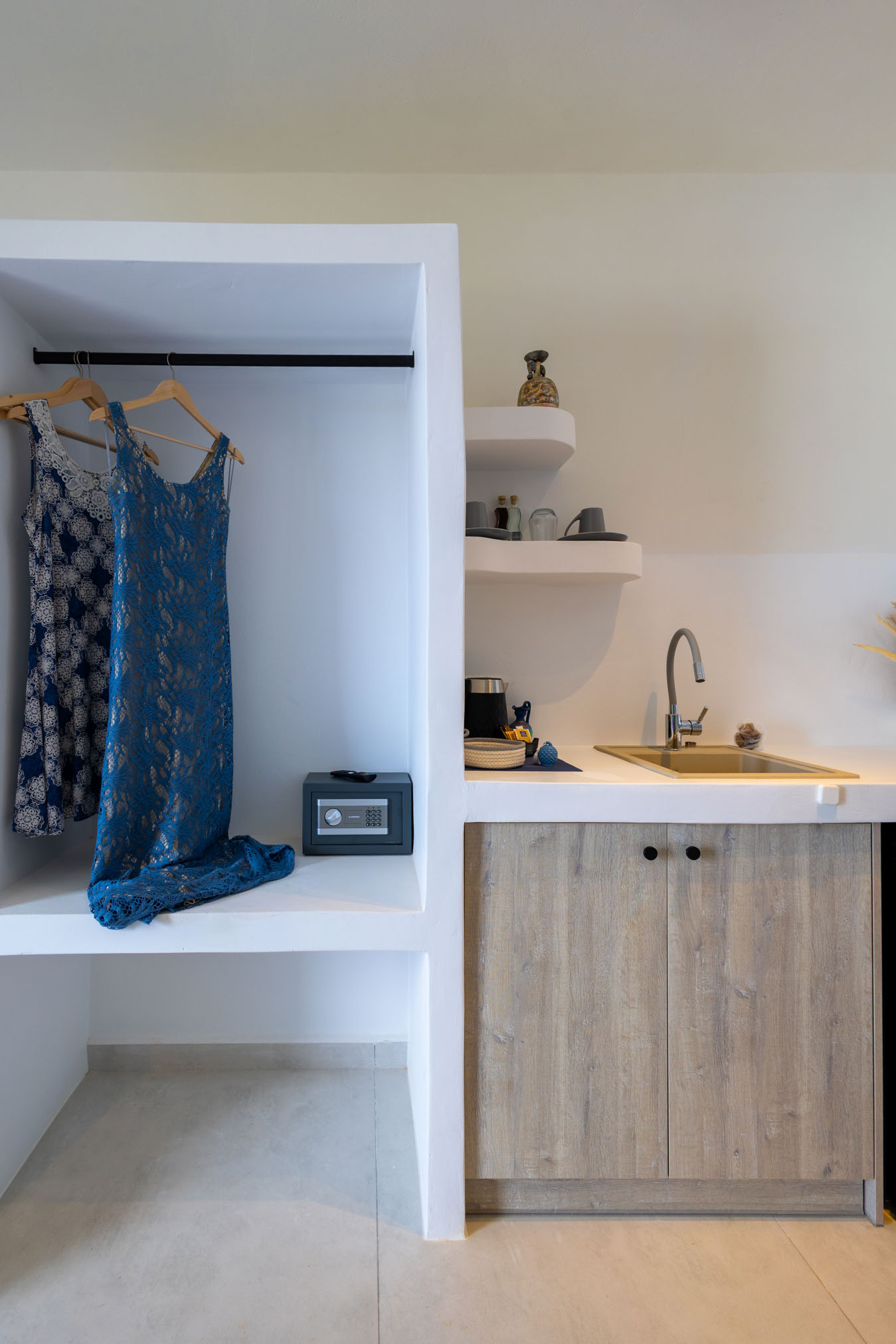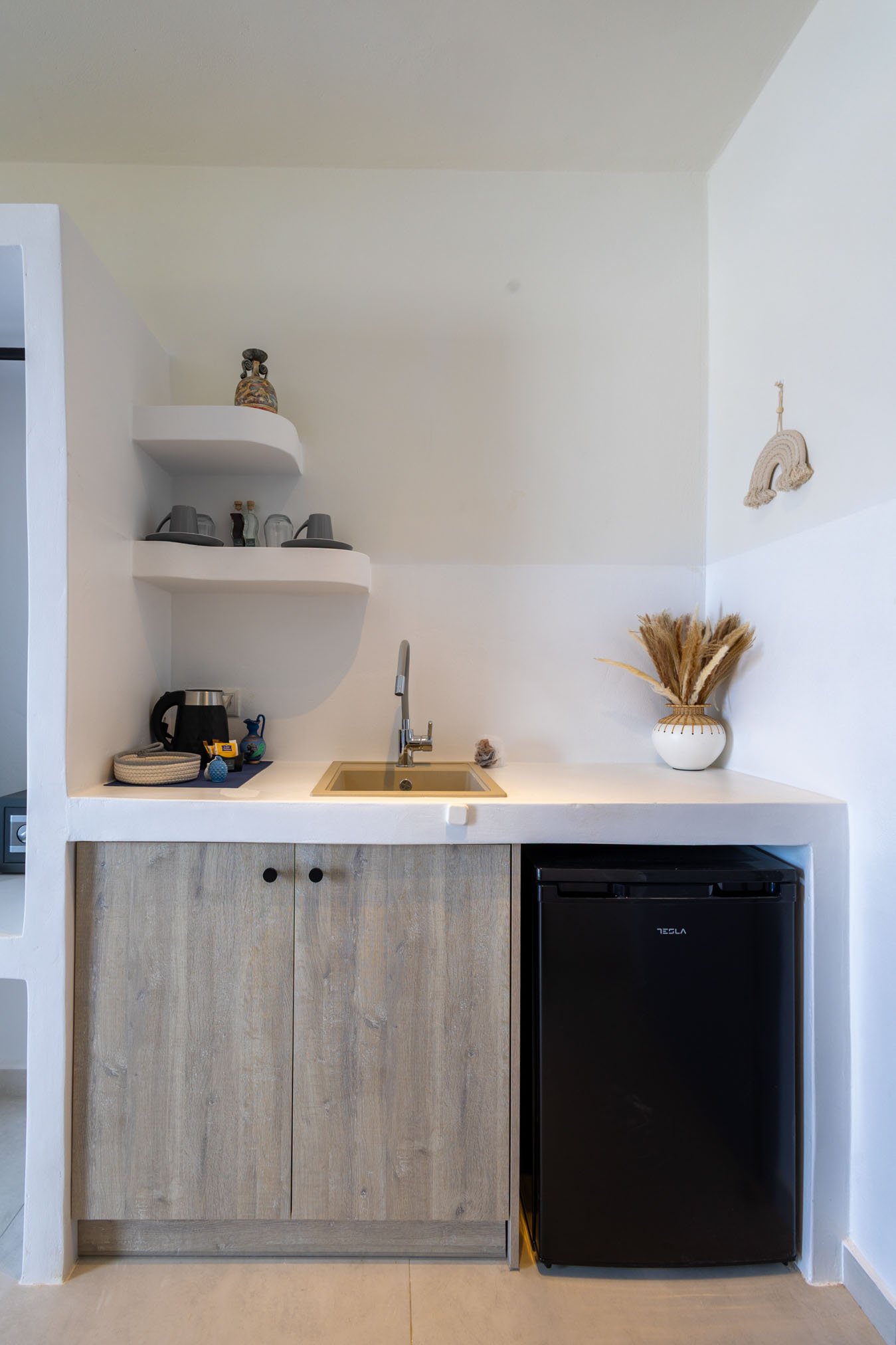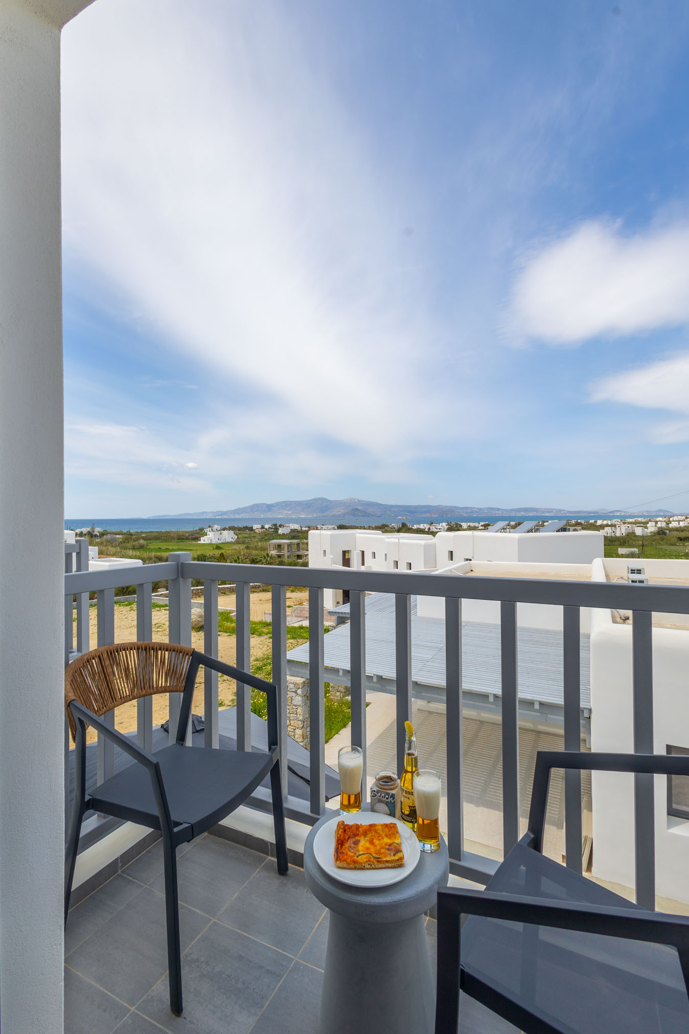 A spacious 25 m2 haven crafted for comfort and calm. Enjoy your morning coffee or evening breeze from the 2.5 m2 balcony, complete with a built-in outdoor sofa and stunning sea view. Designed with natural textures and soothing tones, this room invites you to unwind in true Cycladic elegance.